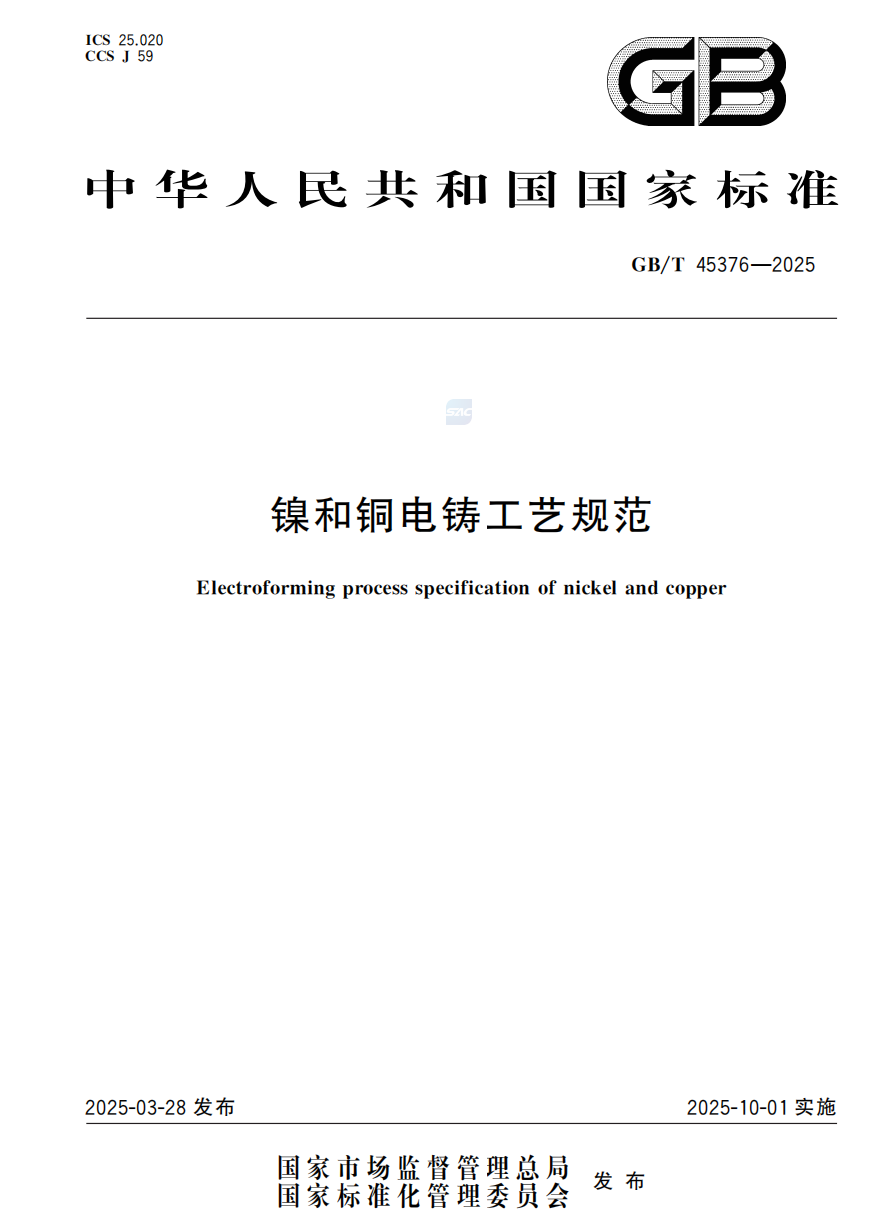 近日,国家市场监督管理总局(国家标准化管理委员会)发布2025年第6号公告,批准216项推荐性国家标准。其中,由3044am永利集团3044noc牵头组织中钞设计制版有限公司、苏州电加工机床研究所有限公司、南通美精微电子有限公司、南京航空航天大学、厦门市标准化研究院、西安交通大学等单位共同研制的GB/T 45376—2025《镍和铜电铸工艺规范》正式发布,并将于2025年10月1日起实施。该标准是我国电铸领域首个国家标准,其发布与实施填补了我国国家标准在该领域的空白,对推动我国电铸技术进步与产业规范化发展具有重要意义。