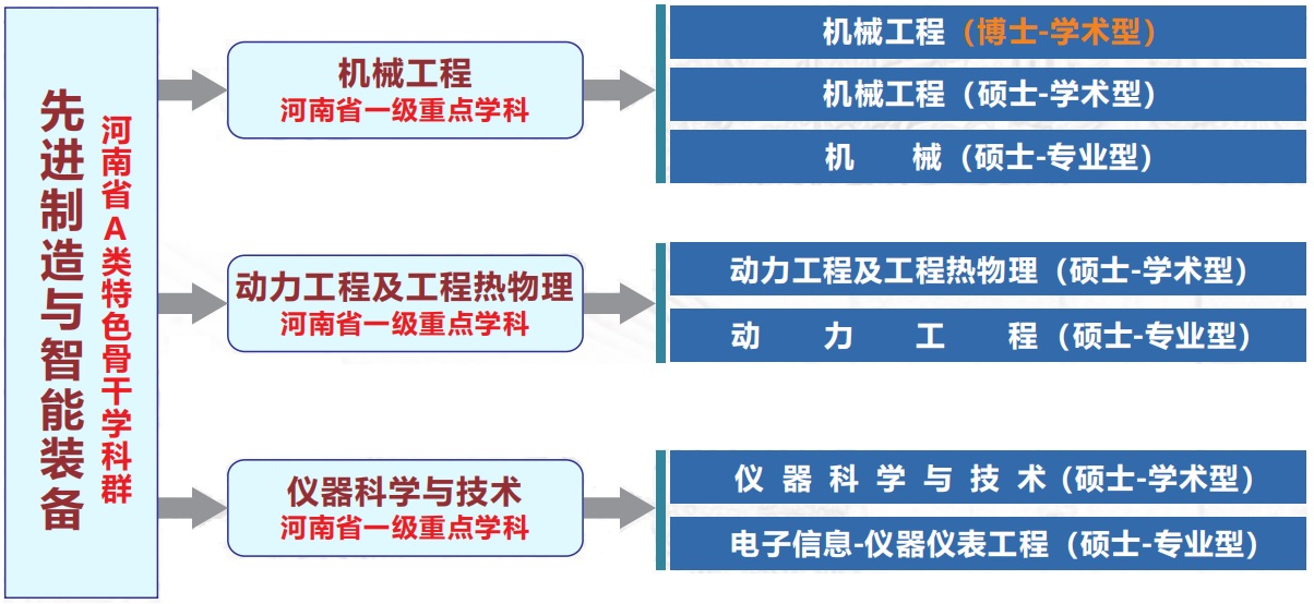机械工程学科学位授权点:1979年开始招收硕士研究生,1986年获批机械设计及理论硕士学位授予权,1994年获批机械制造及其自动化硕士学位授予权,2005年获批机械工程一级学科硕士学位授予权,2006年获批机械制造及其自动化河南省机械领域首个博士学位授予权和工程硕士学位授予权(专业型),2014年获批机械工程博士后科研流动站,2018年获批机械工程一级学科博士学位授予权。